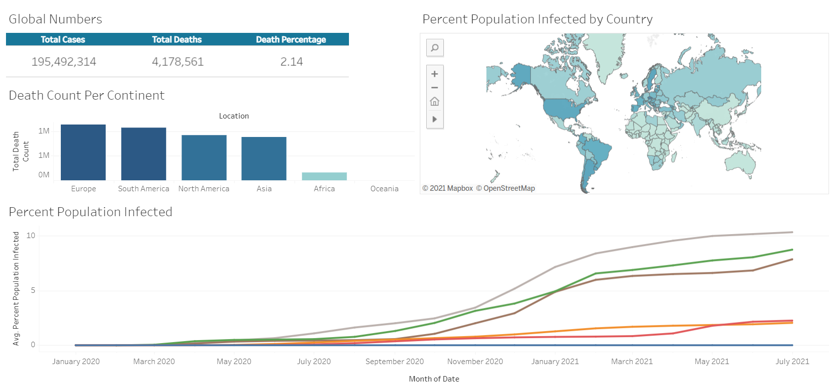 Used Microsoft SQL Server to explore Covid 19 data from major countries and found calculated many metrics like global Infection Rate, Death Rate etc.